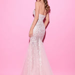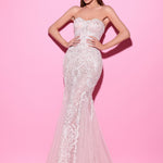 This exquisite strapless gown is adorned with intricate embroidery, creating a delicate and captivating look. The fitted bodice gracefully transitions into a soft, flowing skirt, embodying elegance and timeless beauty.
