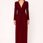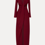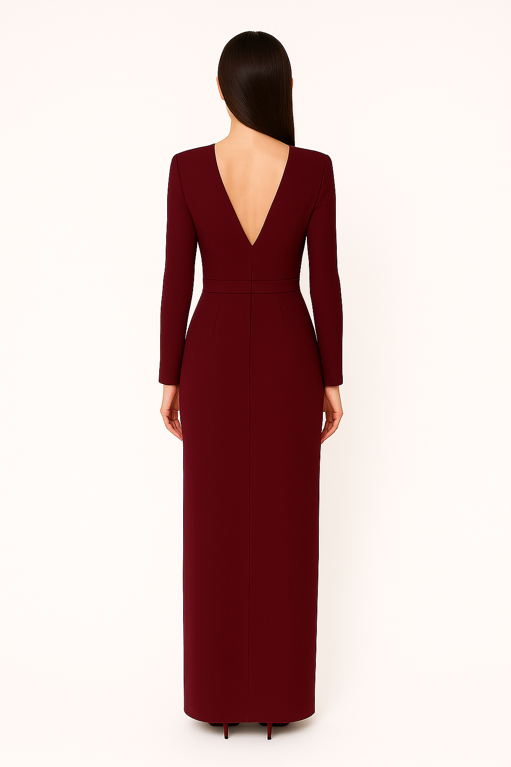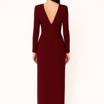 This long-sleeved gown captivates with its draped front design and tailored fit. The subtle slit adds a touch of allure, while its structured silhouette ensures timeless elegance, perfect for formal occasions.