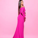 This captivating dress combines a deep neckline with long sleeves, offering a blend of elegance and allure. The figure-hugging silhouette accentuates the waist, while the high slit adds a bold touch to this timeless piece.