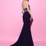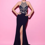 This sophisticated gown showcases an intricate halter neckline embellished with delicate beadwork that exudes elegance. The fitted silhouette features a daring side slit, adding a touch of allure to the overall graceful design.