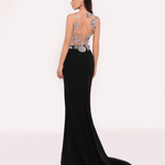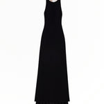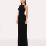 This sleek, sleeveless gown combines simplicity with a touch of elegance. The high neckline and open sides adorned with delicate embellishments create a sophisticated look, making it ideal for evening occasions.