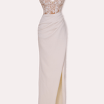 This elegant gown features a delicate lace bodice with thin straps, gracefully balanced by a high-slit skirt. The intricate lace detailing adds a romantic touch, while the flowing silhouette exudes sophistication.