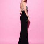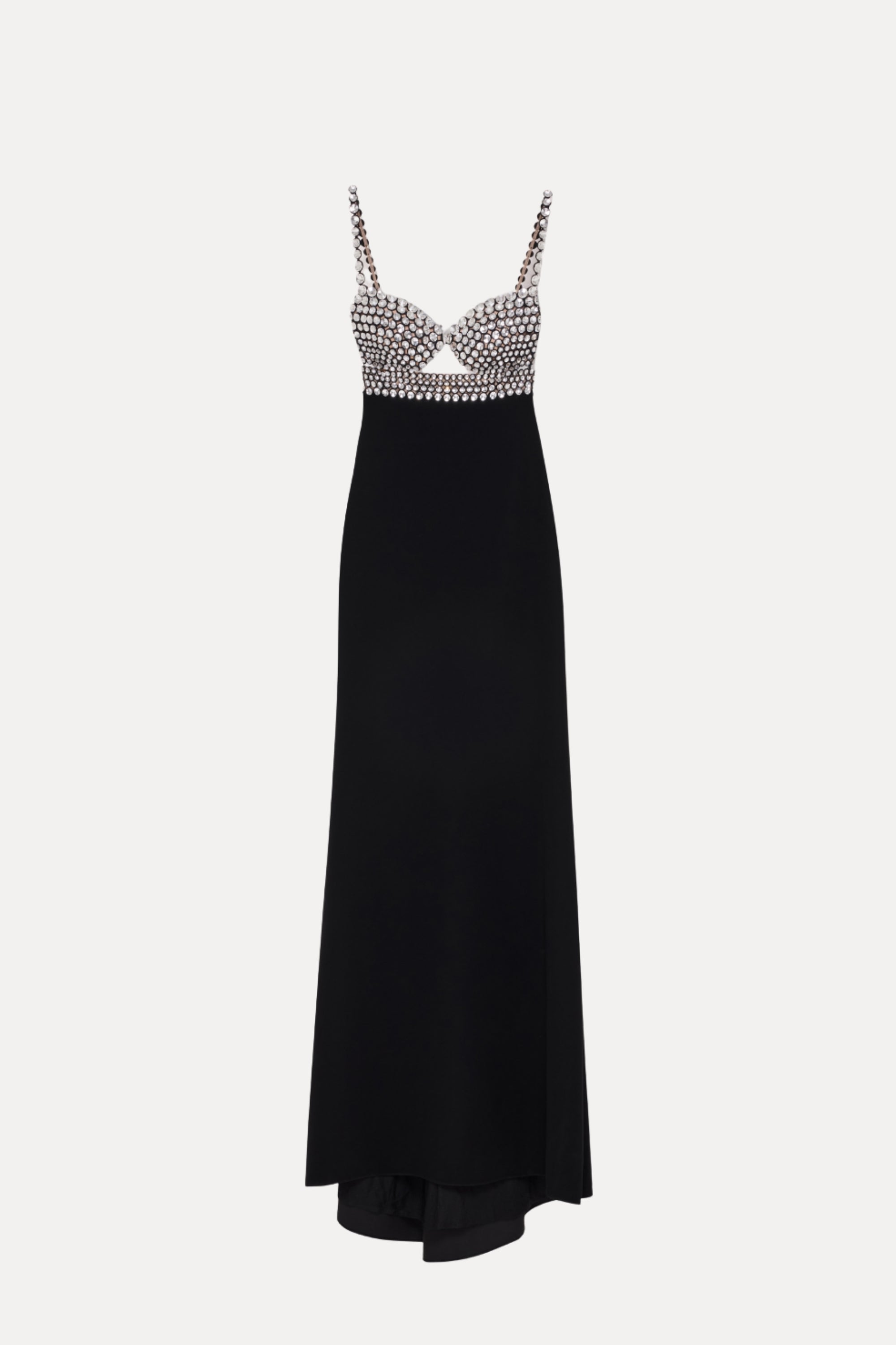 This elegant gown features a fitted silhouette with an intricately embellished bodice, showcasing a unique cut-out detail for added allure. The delicate straps and refined design make it an exquisite choice for evening elegance.