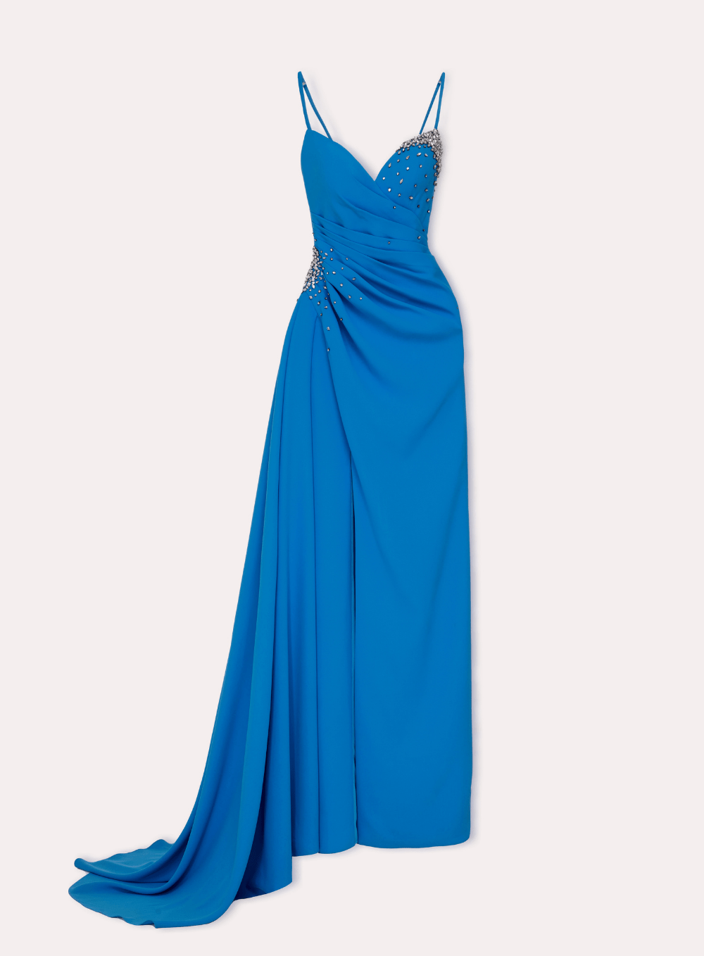 This captivating gown is designed with a sweetheart neckline and delicate spaghetti straps, adorned with shimmering embellishments. The fitted silhouette accentuates the figure, while a high slit and a flowing side train add movement and allure.