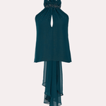 This halter-neck top stands out with its intricate beadwork and flowing chiffon design. The keyhole detail and cascading back add an element of elegance and movement, perfect for a refined and graceful look.