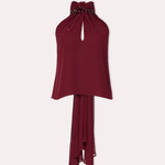 This halter-neck top stands out with its intricate beadwork and flowing chiffon design. The keyhole detail and cascading back add an element of elegance and movement, perfect for a refined and graceful look.