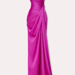 This off-shoulder gown is crafted with a draped bodice and a high slit that adds a touch of allure. The asymmetric design on the neckline creates a sophisticated yet bold look, ideal for special evenings.