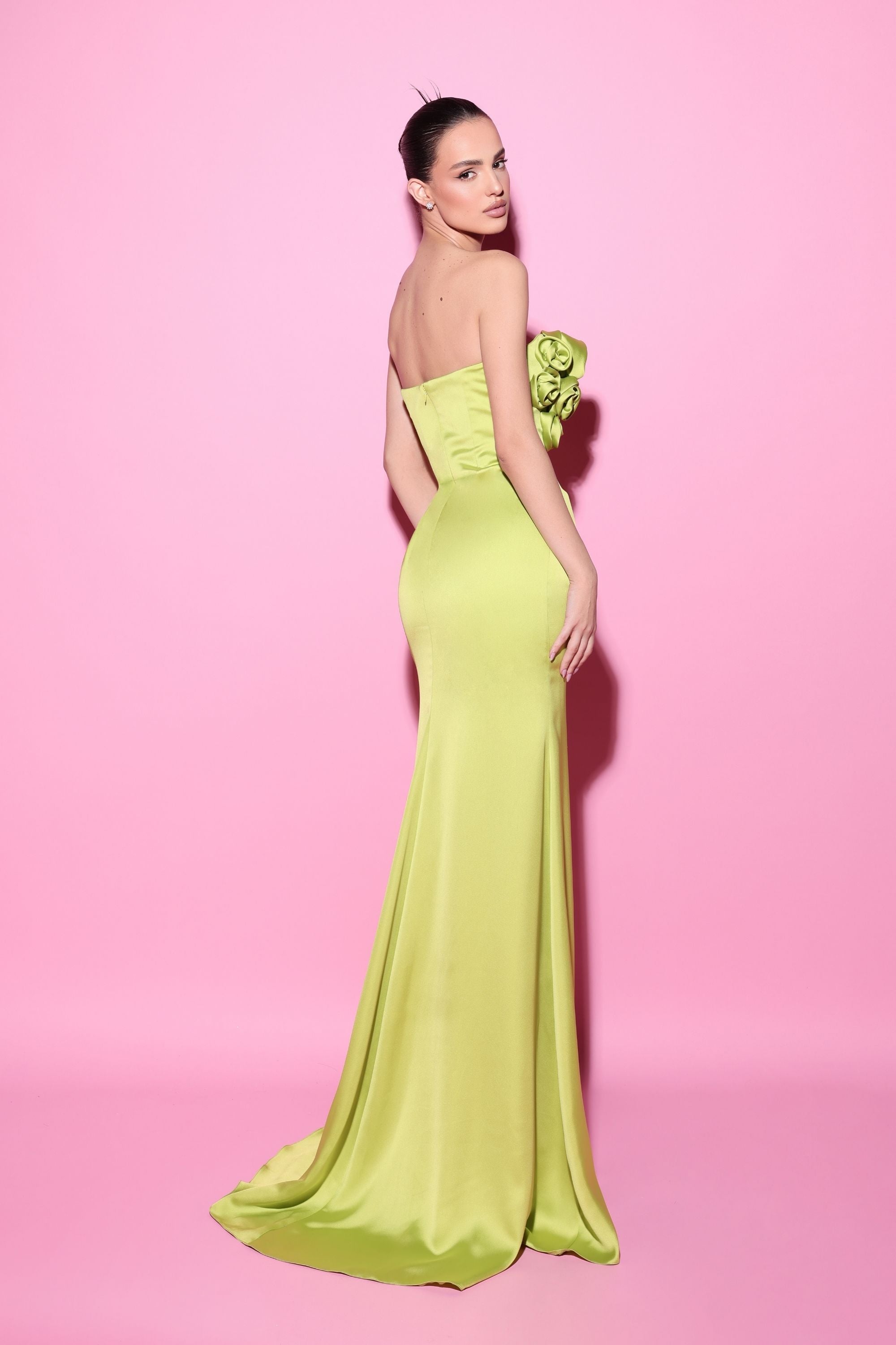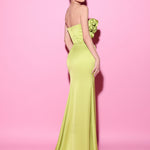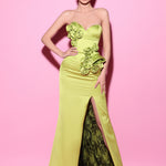 This captivating strapless gown is adorned with intricate rosette detailing that cascades down one side, adding a touch of romance to the sleek silhouette. A daring slit reveals a lace underlayer, infusing a hint of mystery into this bold and unique design.