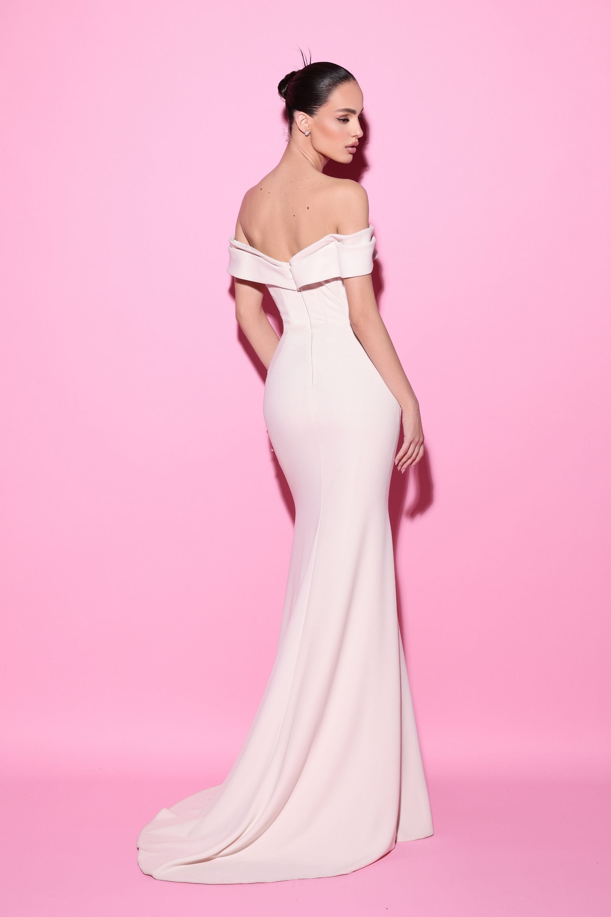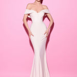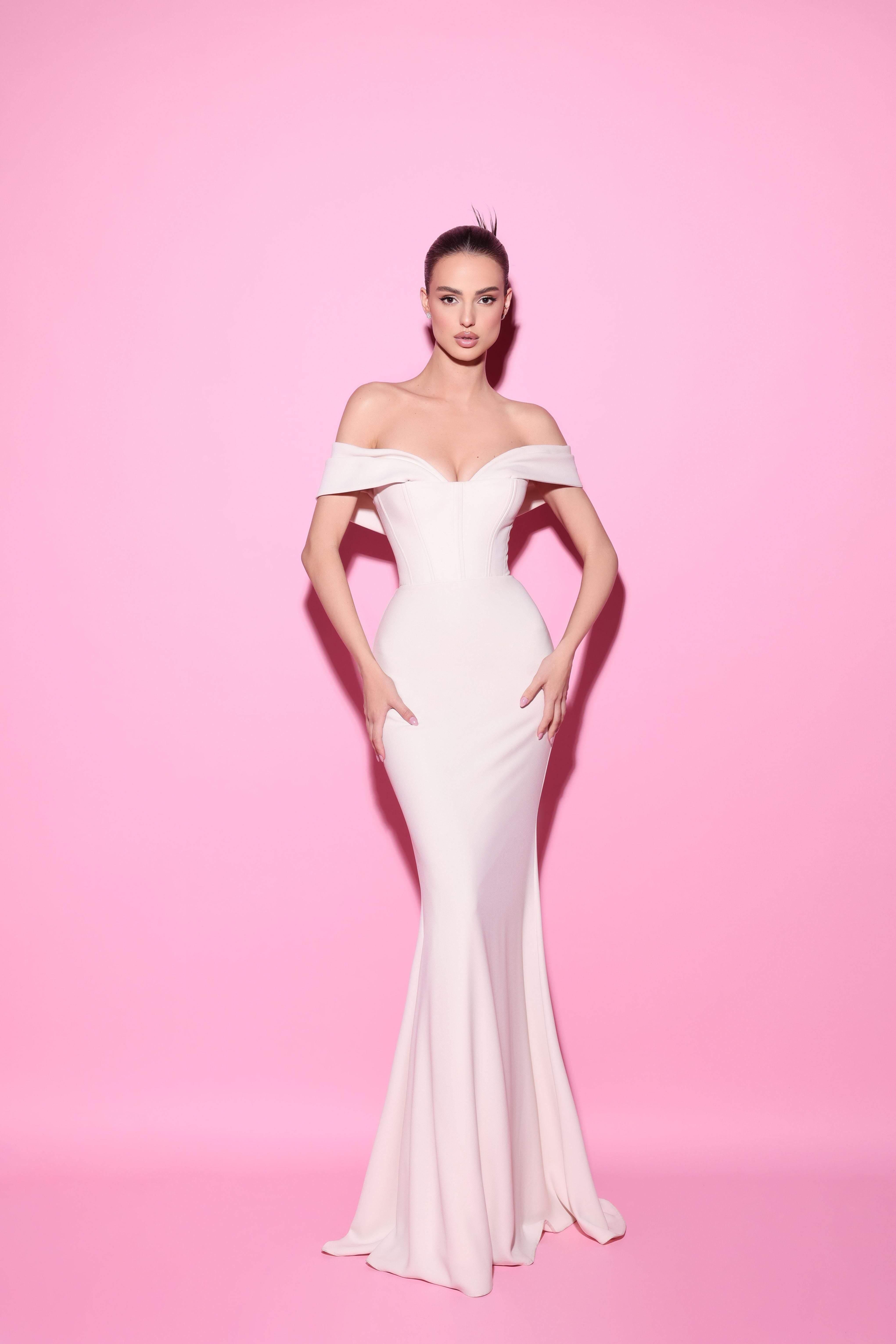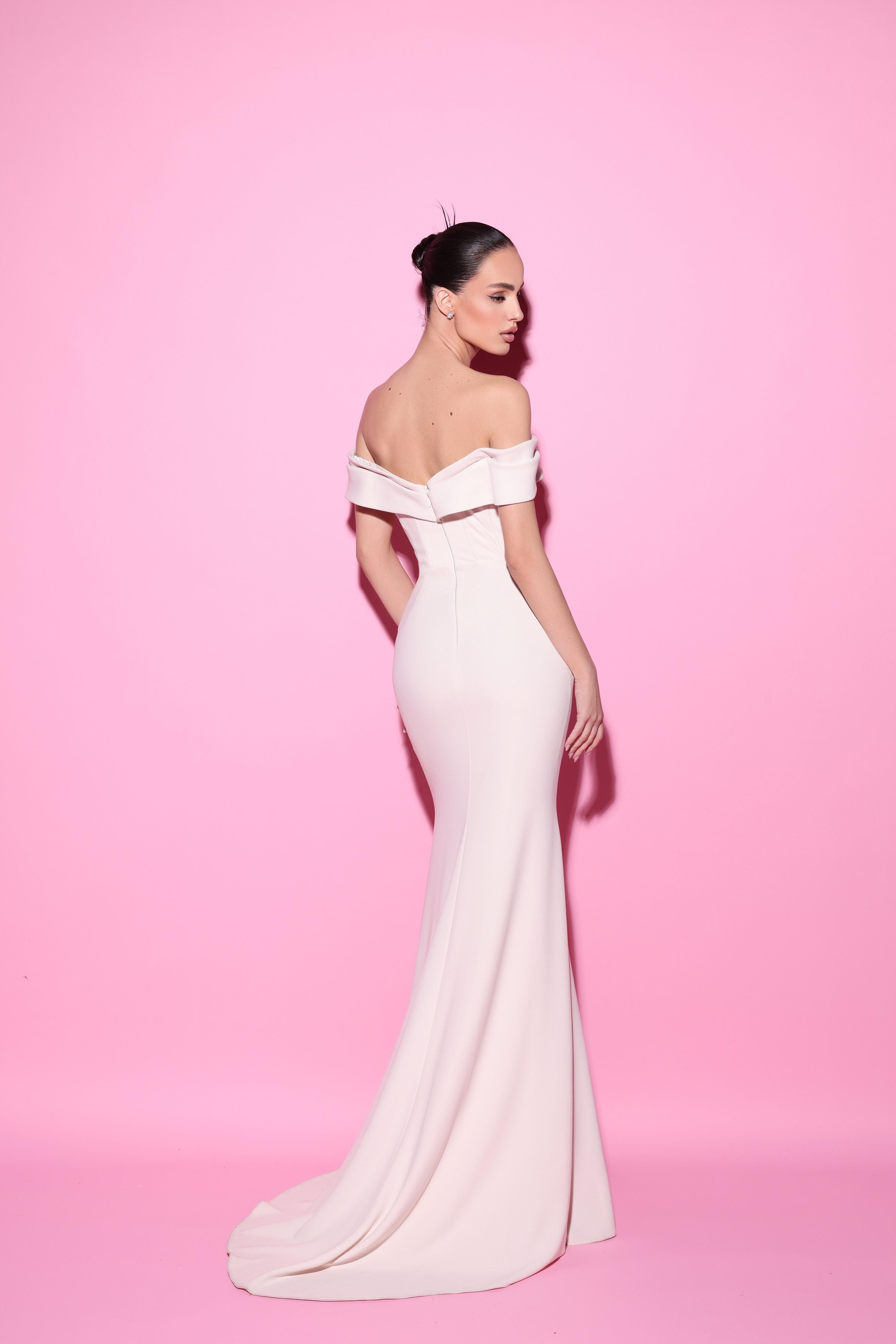 This elegant off-the-shoulder gown exudes sophistication with its fitted silhouette and deep neckline, beautifully enhancing the natural curves. Perfect for making a memorable entrance, this design radiates timeless grace and poise.