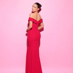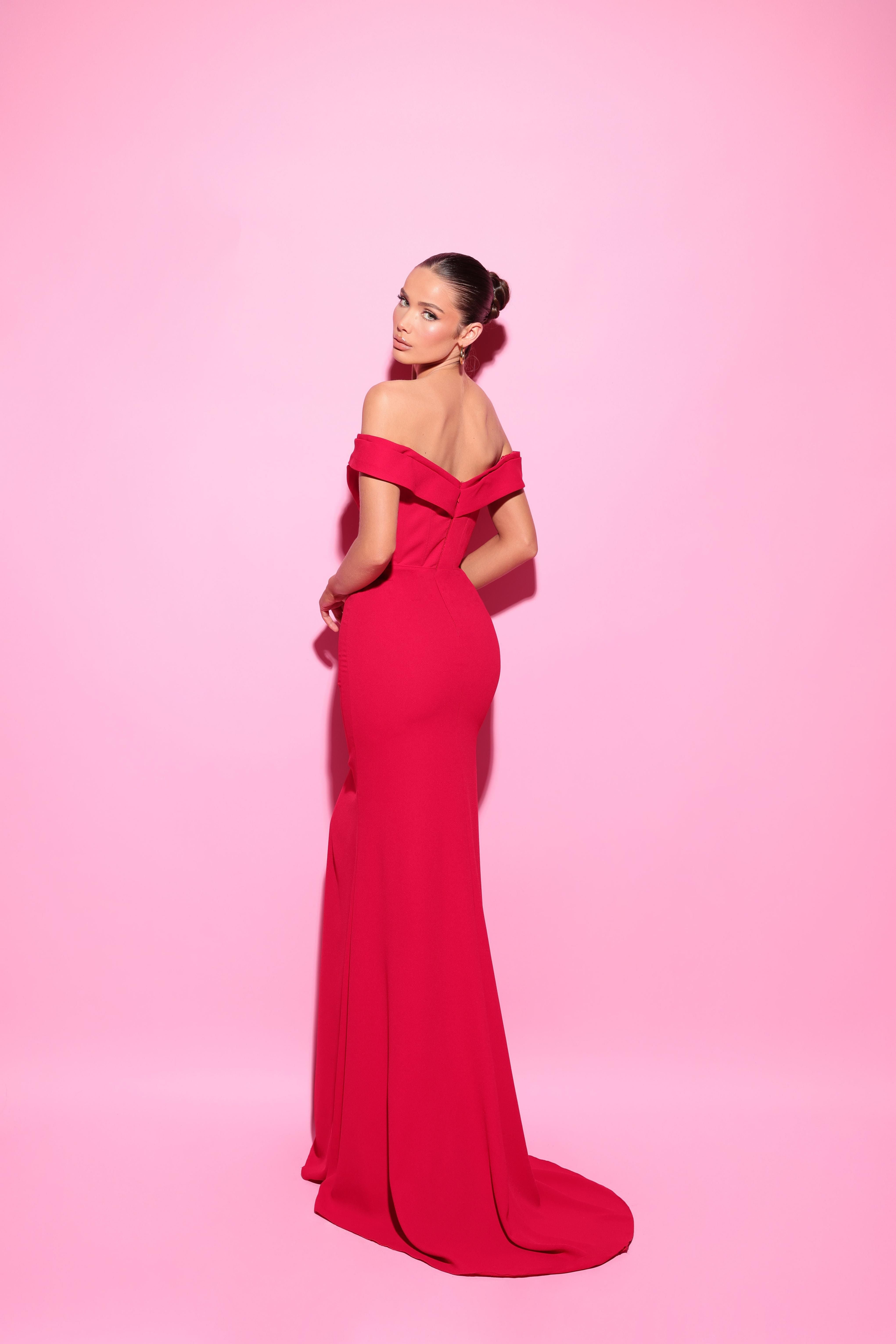 This elegant off-the-shoulder gown exudes sophistication with its fitted silhouette and deep neckline, beautifully enhancing the natural curves. Perfect for making a memorable entrance, this design radiates timeless grace and poise.