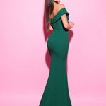 This elegant off-the-shoulder gown exudes sophistication with its fitted silhouette and deep neckline, beautifully enhancing the natural curves. Perfect for making a memorable entrance, this design radiates timeless grace and poise.