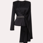 This asymmetrical satin blouse stands out with its draped details and an embellished waistband that enhances the silhouette. A sophisticated choice for evening elegance.