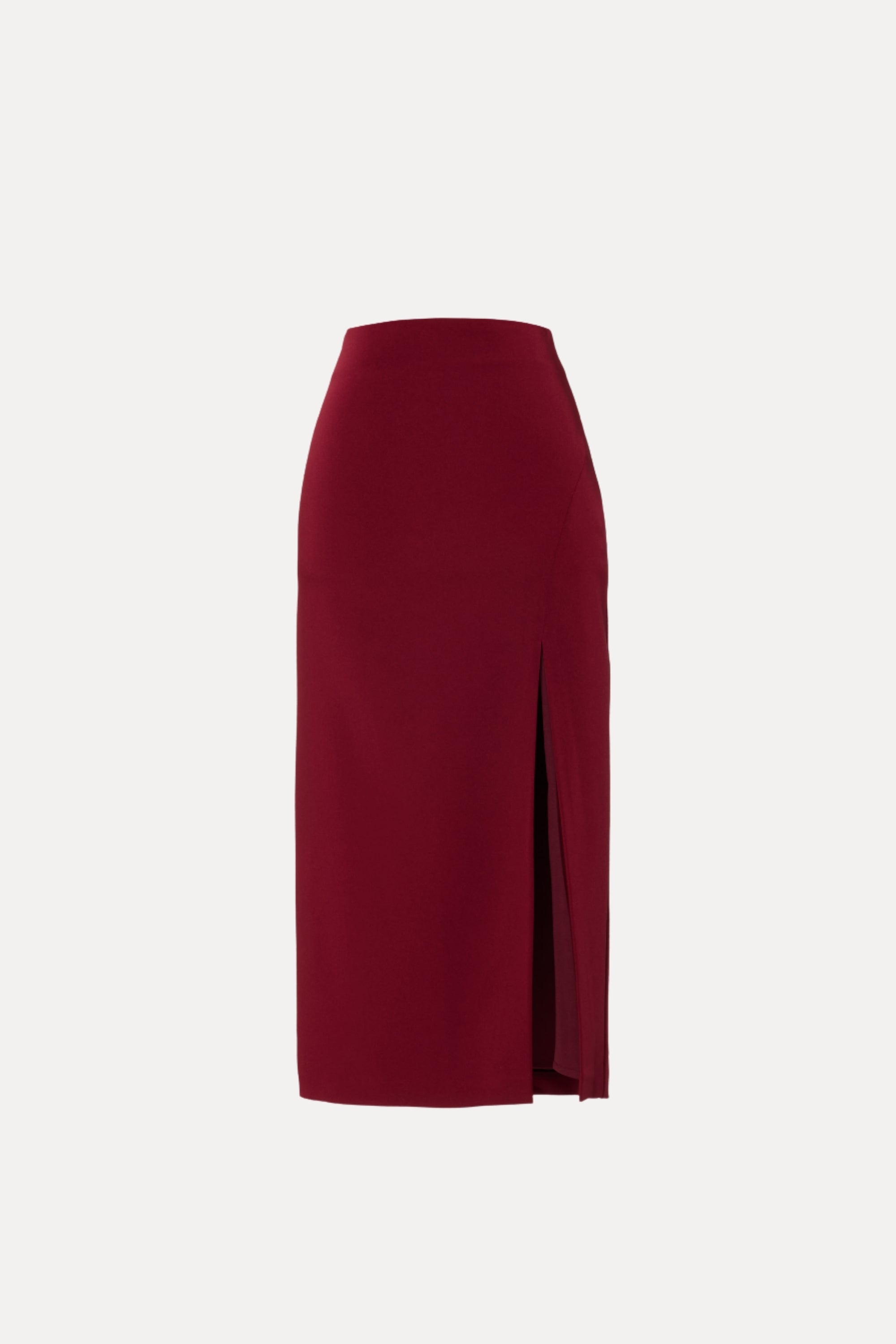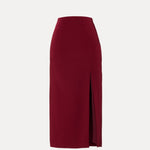 This midi pencil skirt features a sleek silhouette with a subtle side slit, adding a modern touch to its classic design. A timeless piece that embodies effortless elegance.