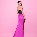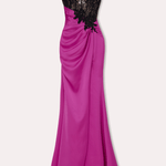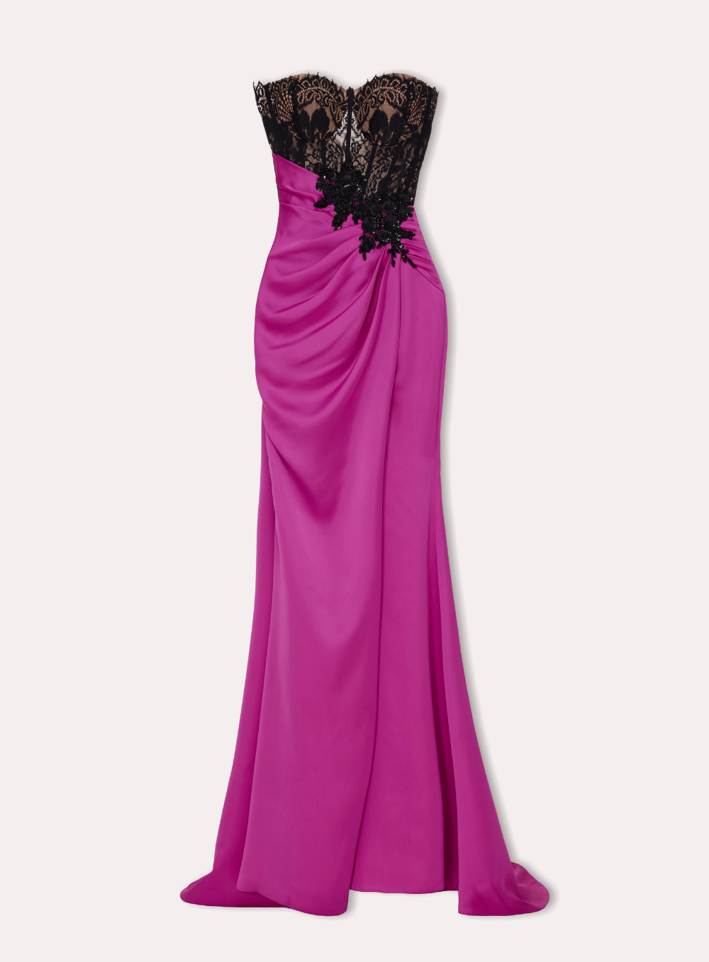 This dress combines elegance with allure, featuring a strapless, lace-embroidered bodice and a satin skirt with a high slit. The intricate lace detail around the waist accentuates the silhouette, adding a touch of sophistication to the bold design.