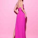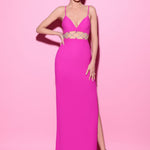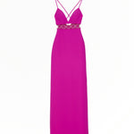 This sleek gown features delicate straps and a fitted silhouette, with an alluring diamond-studded cut-out detail at the waist, adding a touch of sparkle and sophistication.