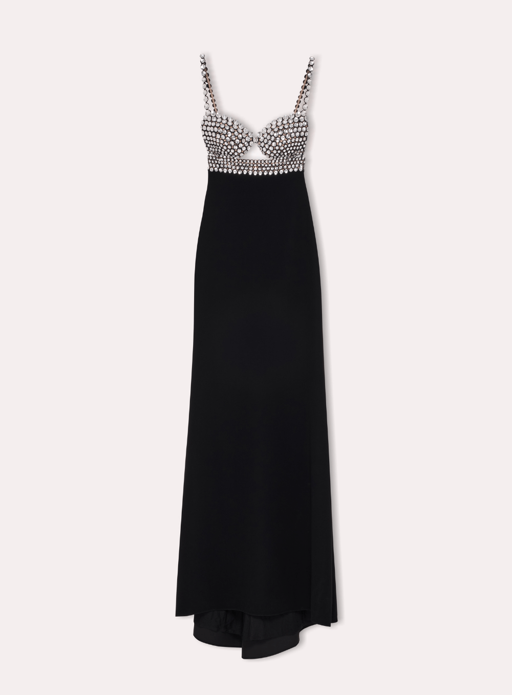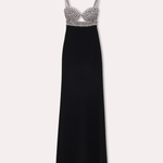 This elegant gown features a fitted silhouette with an intricately embellished bodice, showcasing a unique cut-out detail for added allure. The delicate straps and refined design make it an exquisite choice for evening elegance.