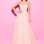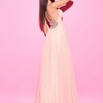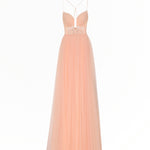 This gown exudes romance with its delicate tulle skirt and sweetheart neckline. The subtle sheer detail on the bodice adds a touch of elegance, making it perfect for an enchanting evening look.