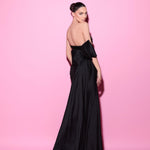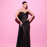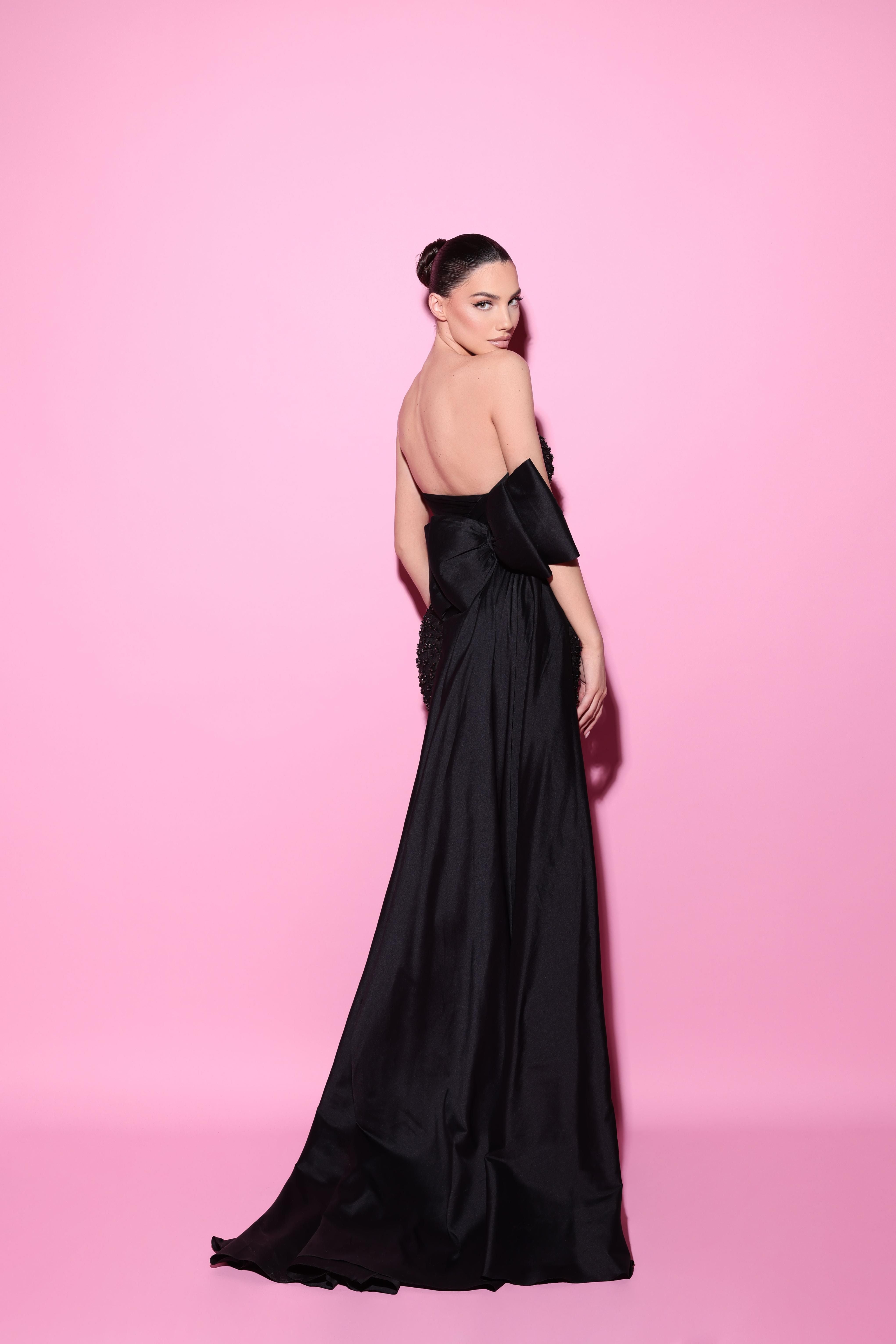An enchanting strapless gown adorned with intricate embellishments, designed to create a sleek, figure-hugging silhouette. The grand bow detail at the back adds a touch of elegance and drama, making this gown perfect for a truly special evening.