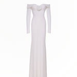 This off-the-shoulder gown exudes sophistication with its fitted silhouette and elegant long sleeves. The corset-style bodice, adorned with a delicate floral detail, accentuates the waist, creating a strikingly refined look for evening events.