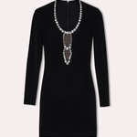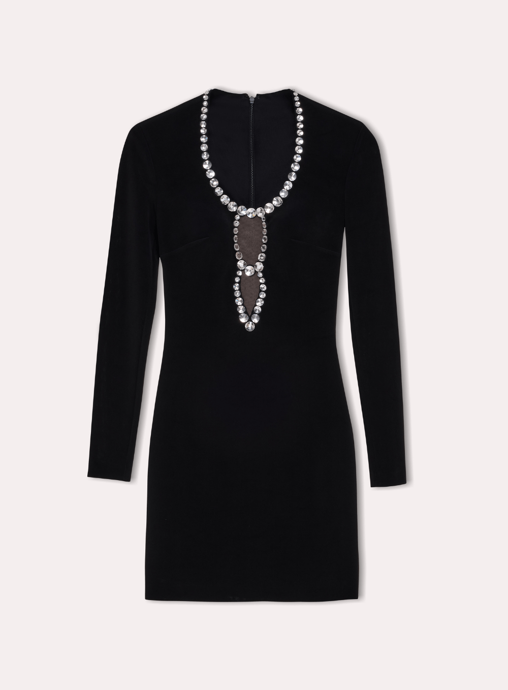 This mini dress brings bold elegance with its deep keyhole neckline framed by sparkling embellishments. The long sleeves add a touch of sophistication, making it a stylish choice for evening events.
