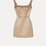 This mini dress exudes sophistication with its square neckline and embellished shoulder straps, adding a touch of sparkle. Fitted to accentuate the silhouette, its ideal for making a refined statement at any occasion.