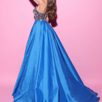 An enchanting gown with a shimmering bodice adorned in sequins, creating an alluring sparkle. The voluminous skirt flows gracefully, featuring a daring thigh-high slit for added drama and movement.