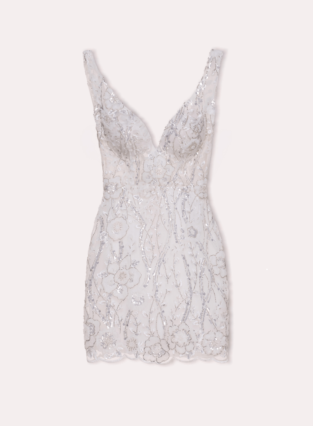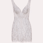 This stunning mini dress features delicate lace and intricate embroidery, accentuated by a plunging neckline that adds a touch of elegance. Perfect for those looking to make a statement with timeless charm.
