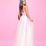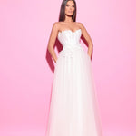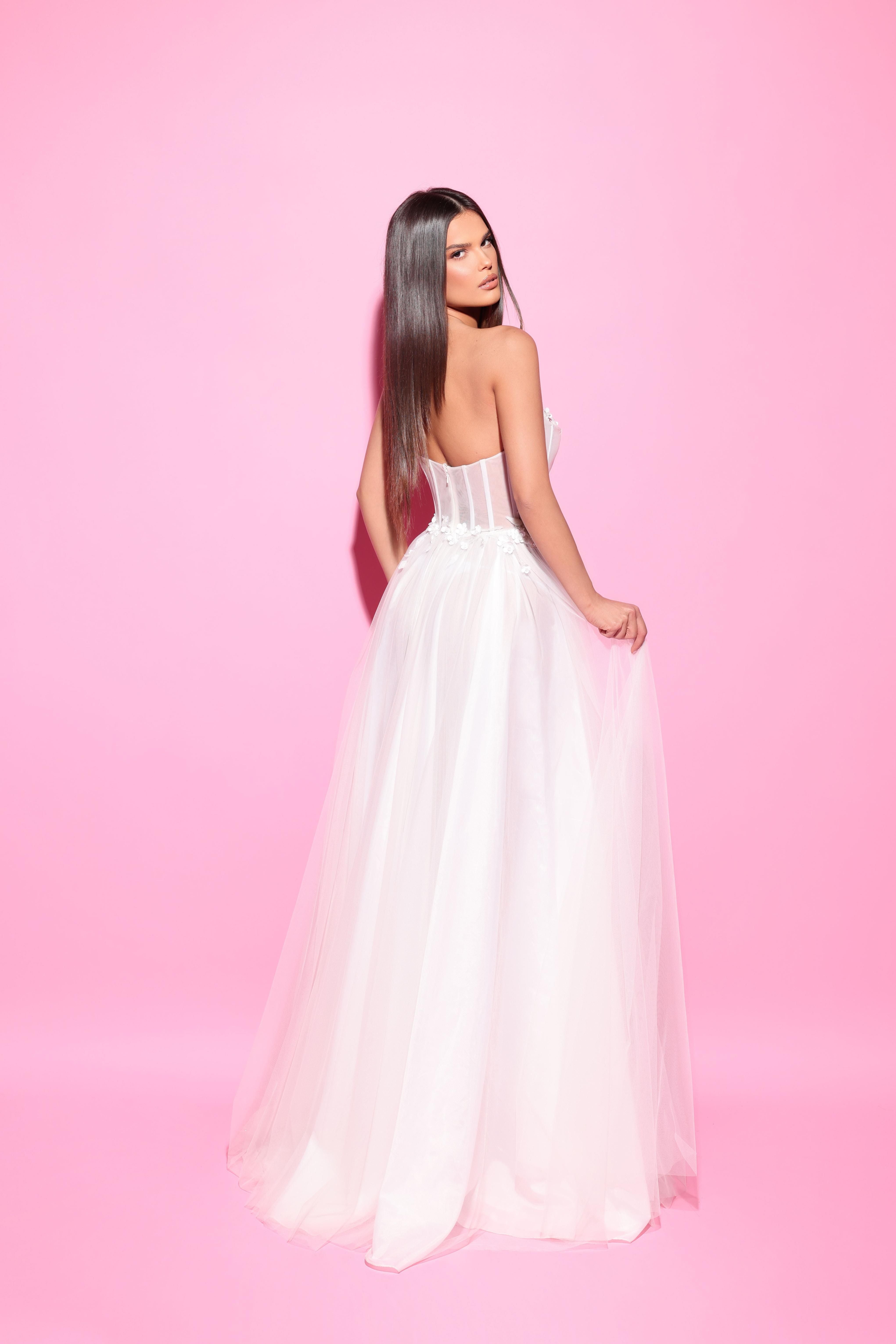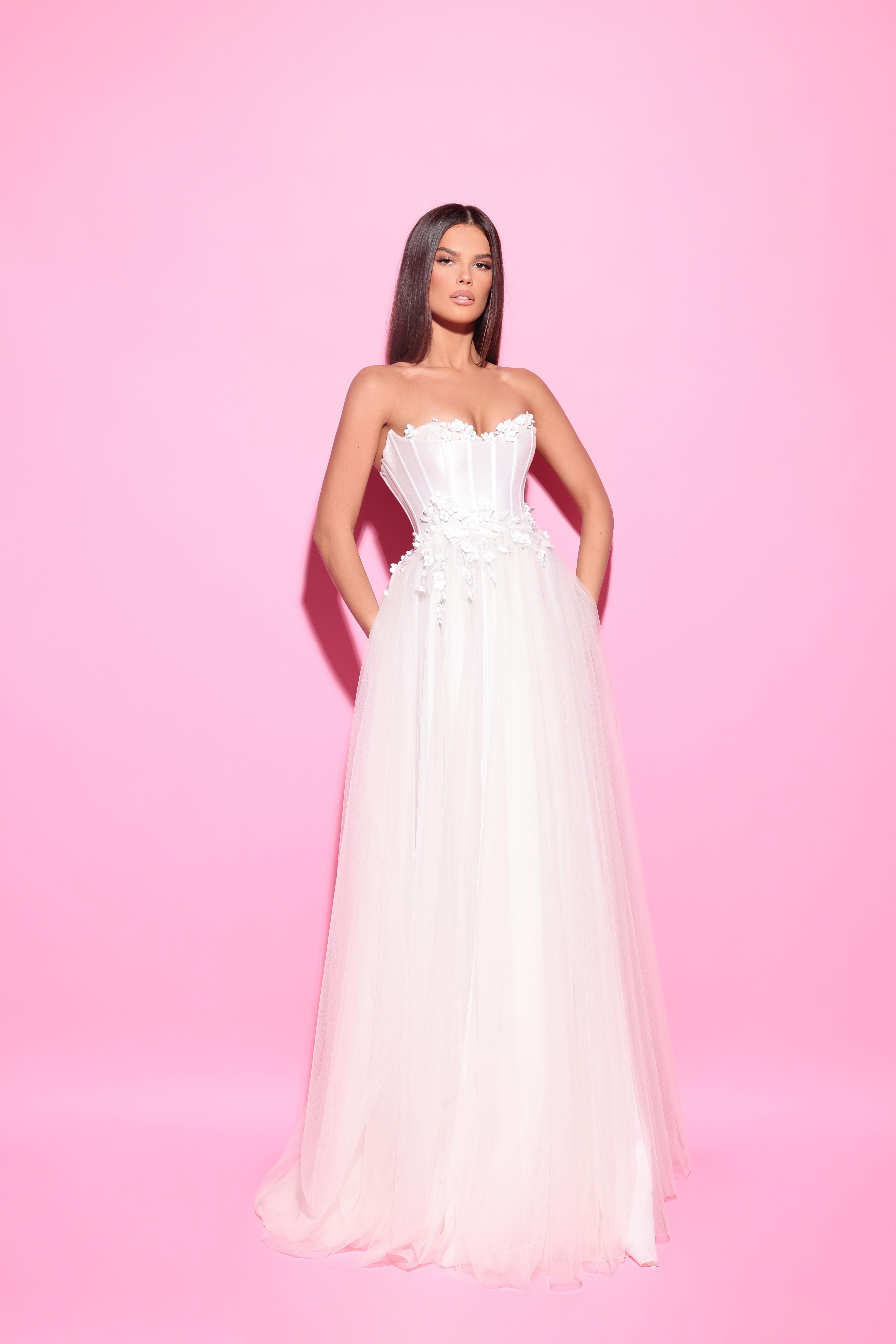 This ethereal gown features a structured corset bodice adorned with delicate floral appliqués, flowing into a full tulle skirt. The strapless design enhances the neckline, creating a romantic and graceful silhouette perfect for memorable occasions.