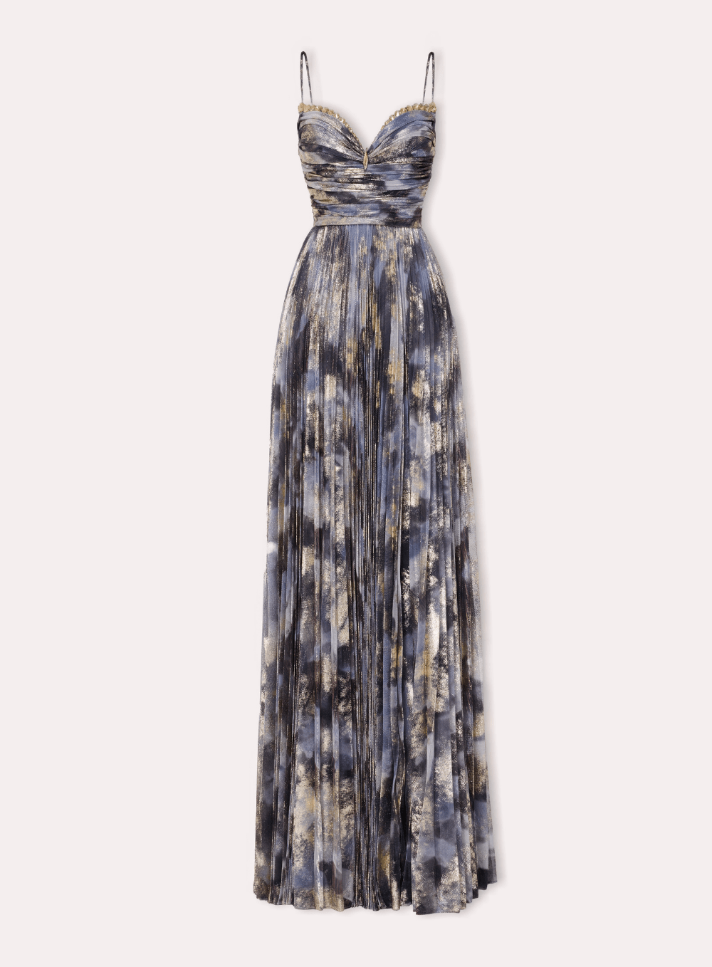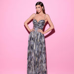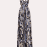 This captivating gown features a ruched bodice with delicate spaghetti straps and a sweetheart neckline, flowing into a pleated full-length skirt. The abstract print adds an artistic touch, perfect for an evening of elegance and style.