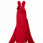 This sleek and sophisticated gown features a strapless sweetheart neckline with a subtle front cut-out, adding allure. A floral detail on the waist creates a feminine charm, while the fitted silhouette enhances elegance.