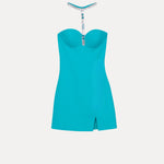 This strapless mini dress exudes modern glamour with a structured bust and a sparkling halter detail that extends down the front. A subtle side slit completes the chic and daring look.