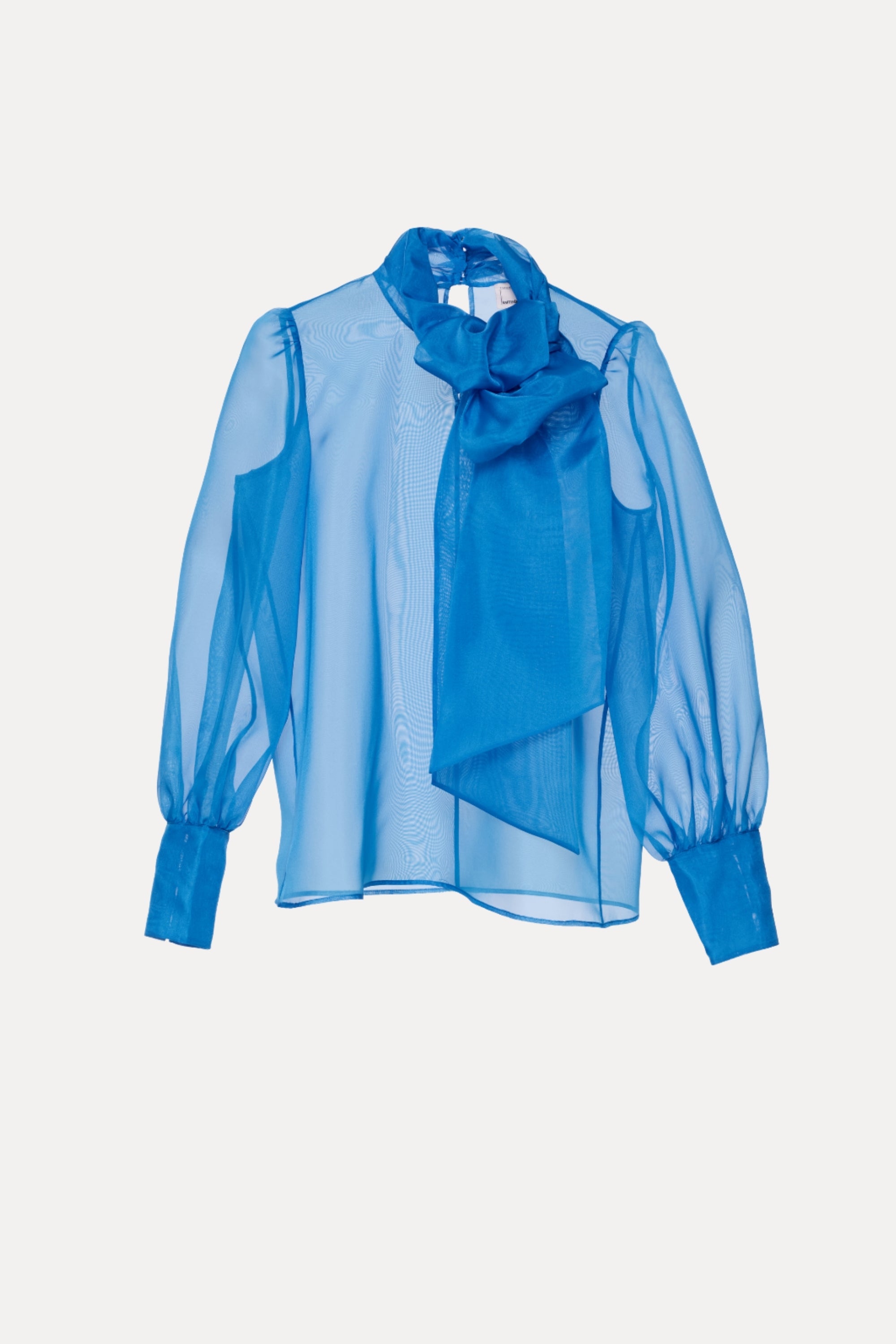 This sheer blouse exudes ethereal charm with its airy fabric and voluminous silhouette. The statement bow detail at the neckline enhances its feminine allure, making it a timeless piece for an elegant wardrobe.