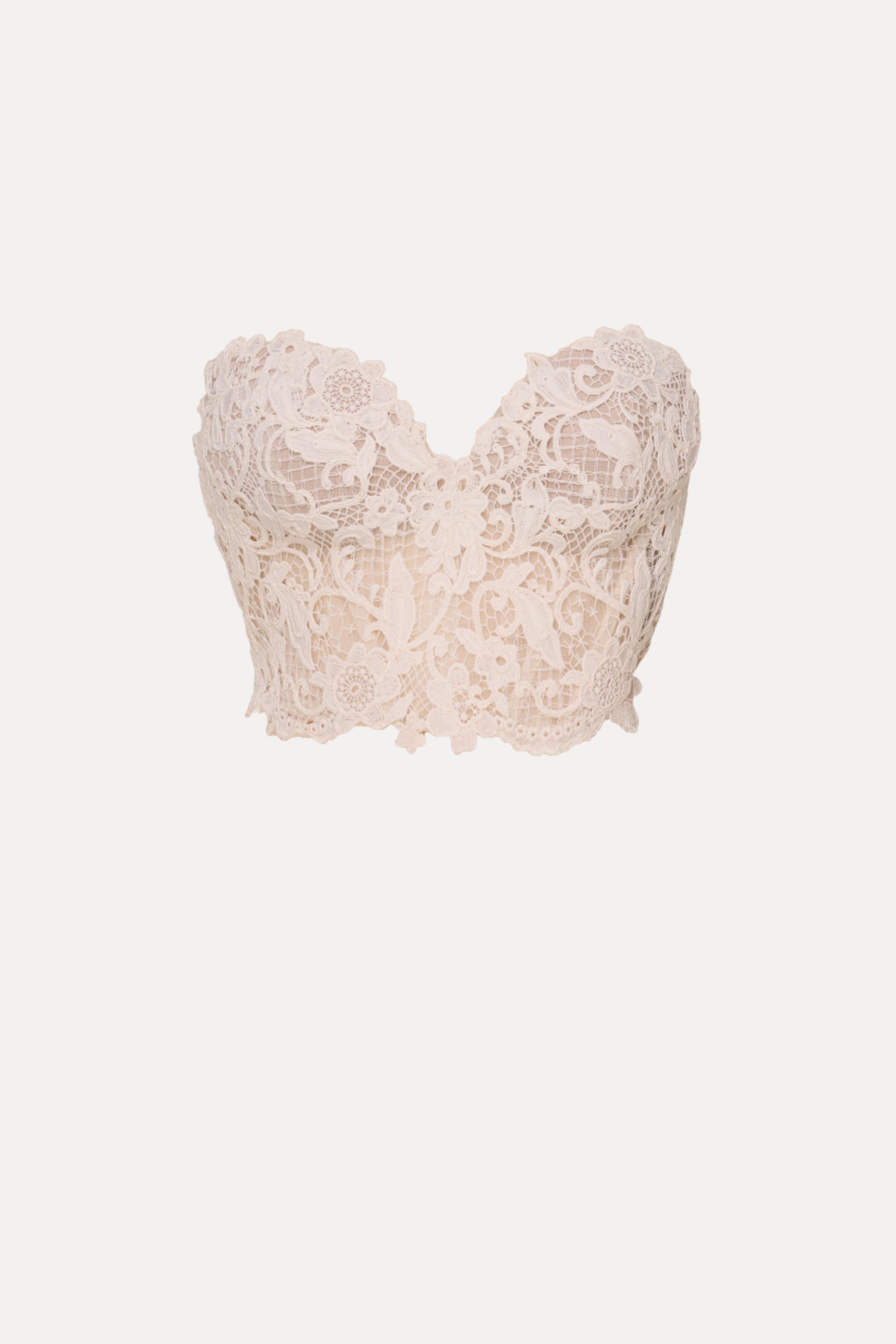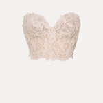 This delicate lace bustier showcases an intricate floral pattern, offering a romantic and timeless appeal. Its structured design adds both comfort and elegance, perfect for pairing with formal or modern ensembles.