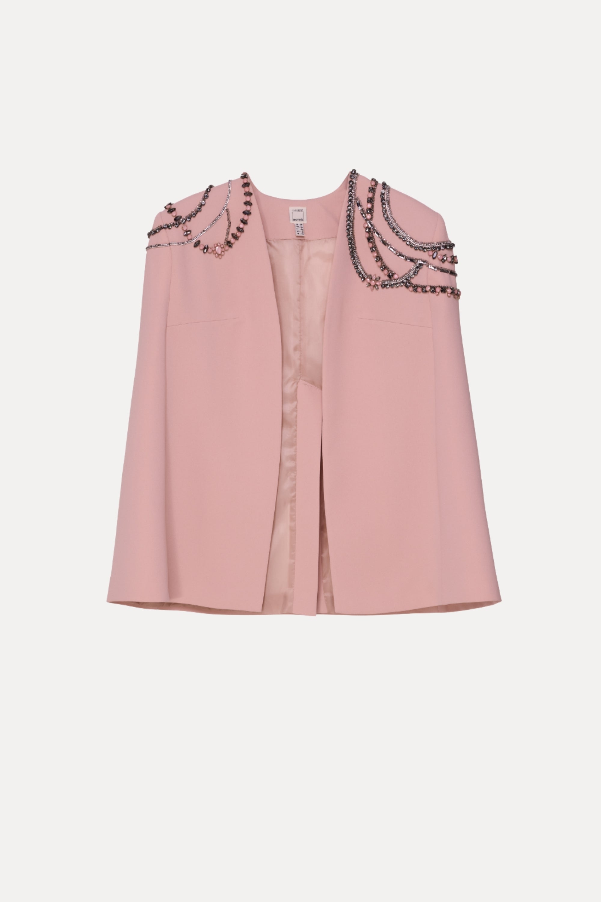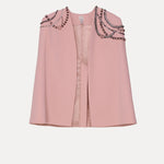 This elegant cape is adorned with intricate beadwork and chain detailing across the shoulders, adding a touch of sophistication to its structured design. A refined statement piece for timeless elegance.