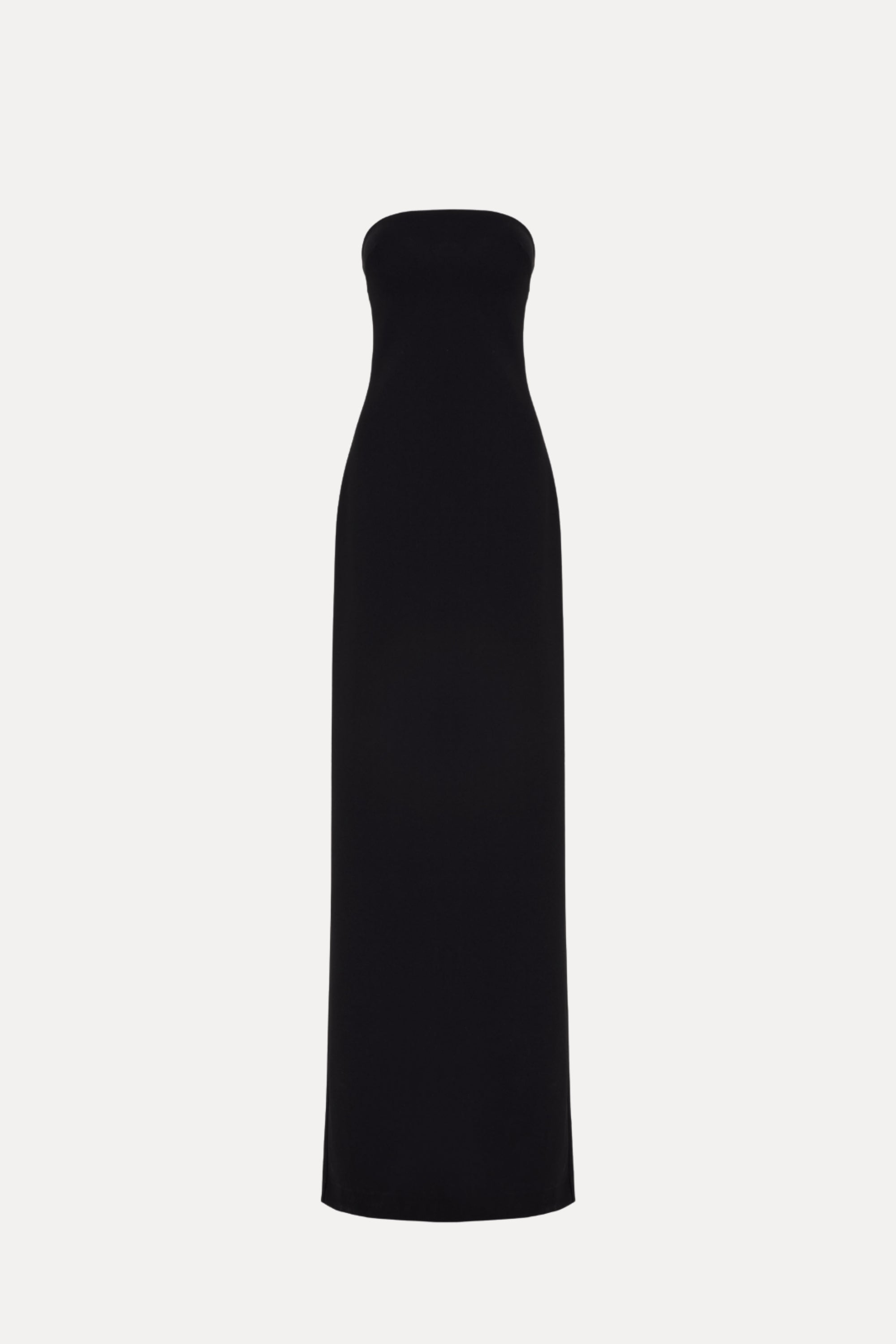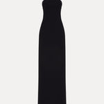 This strapless column gown features a minimalist silhouette that exudes timeless elegance. The clean and sleek design makes it a refined choice for formal occasions and sophisticated settings.