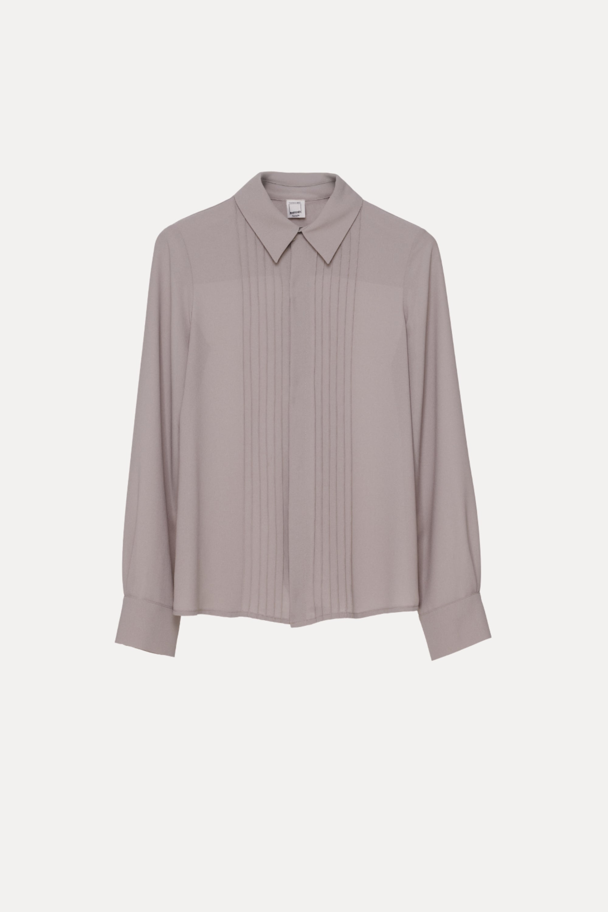 This long-sleeved blouse offers timeless elegance with its clean lines and pleated front detail. The classic collar and structured cuffs make it a versatile choice for a polished and sophisticated look.
