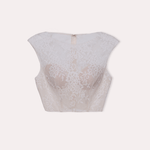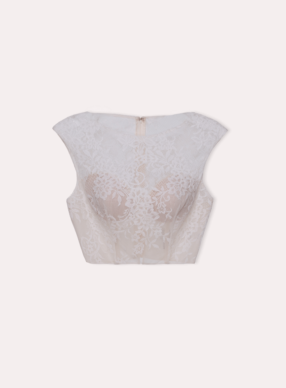 This sleeveless lace bustier features intricate floral patterns and a structured silhouette for a timelessly romantic look. Its sheer detailing adds a subtle allure, perfect for special occasions.
