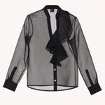 This sheer blouse brings a touch of drama with its ruffled front detail and structured cuffs. Its lightweight fabric and elegant silhouette make it a refined choice for contemporary sophistication.