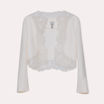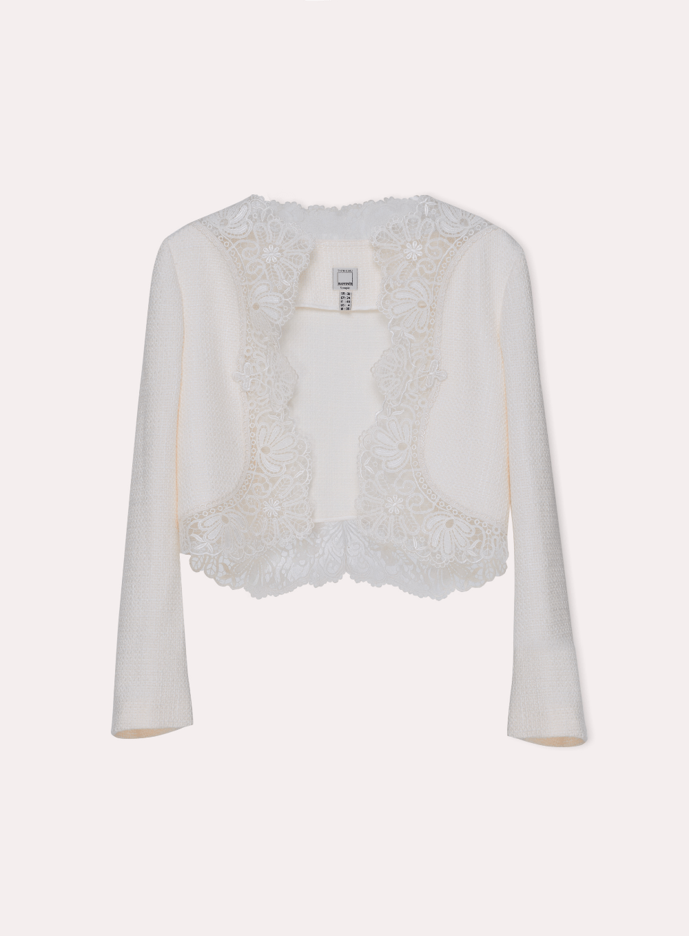 A cropped textured jacket with delicate lace detailing on the edges, offering a touch of elegance to any look. Perfect for layering over dresses or evening wear.