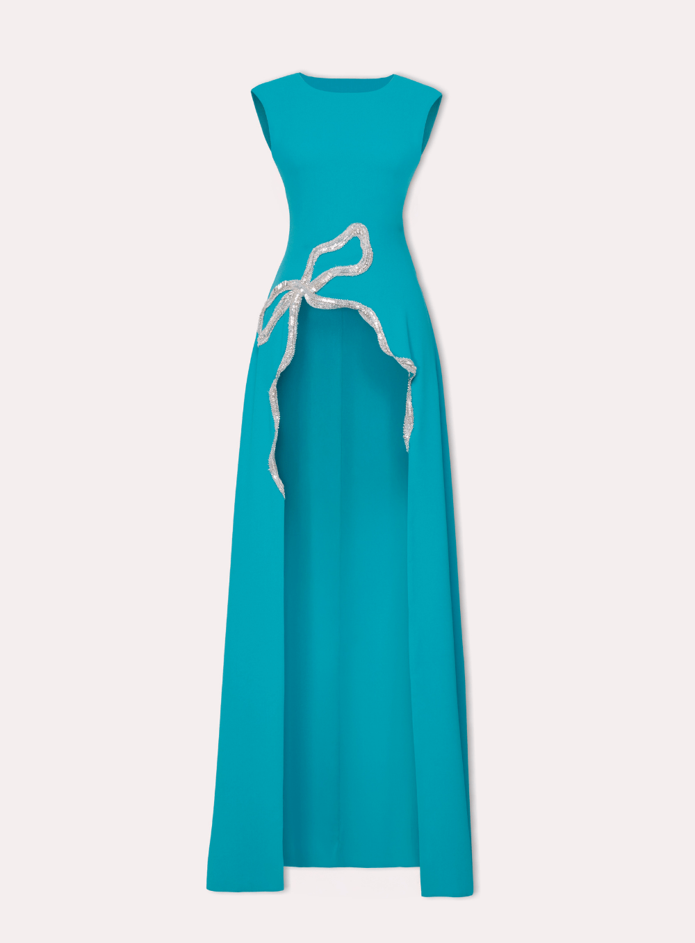 This sleeveless tunic redefines contemporary elegance with its asymmetrical design and bold cutout detail. The shimmering bow embellishment adds a touch of playful sophistication. Perfect for pairing with tailored trousers or skirts, it offers a standout look for any occasion.
