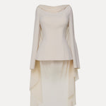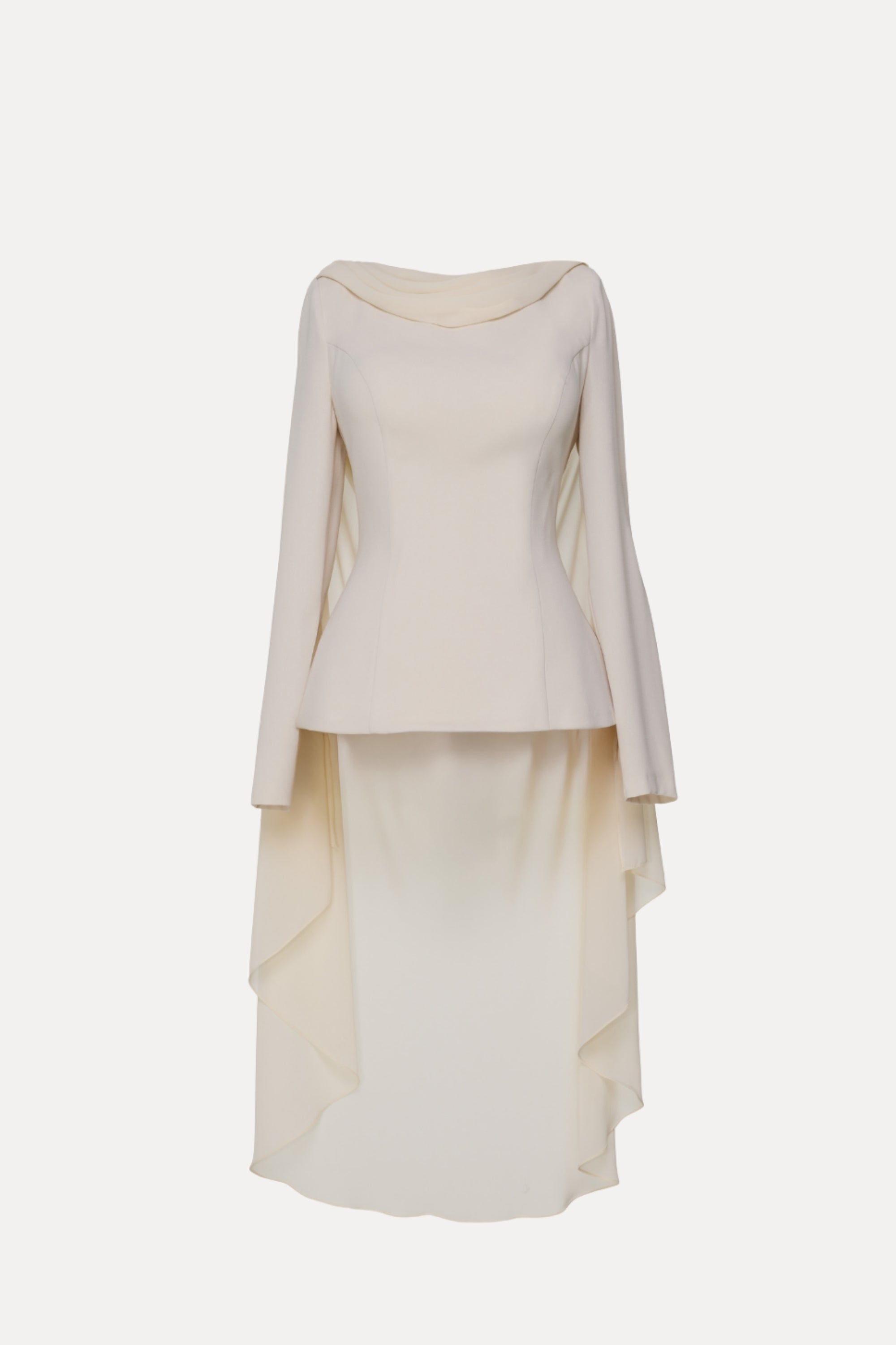 This sophisticated ensemble features a draped neckline and flowing chiffon details, creating a graceful and elegant silhouette. Ideal for formal occasions, its timeless design exudes effortless refinement.
