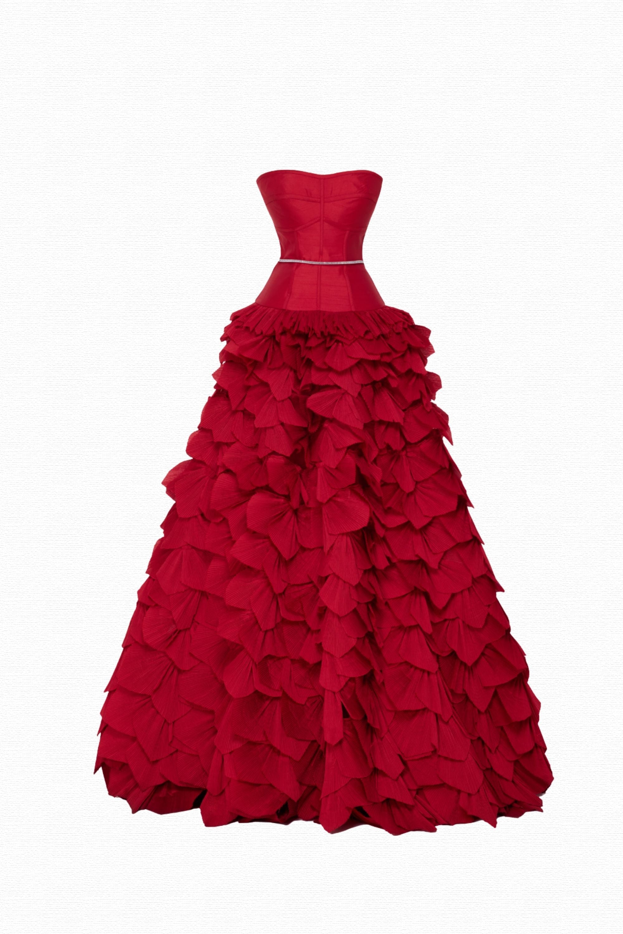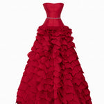 This strapless gown radiates bold elegance with its structured bodice and voluminous skirt adorned with layered petal-like details, creating a captivating 3D effect. Perfect for making a grand statement, this dress embodies sophistication and drama.