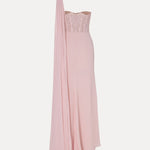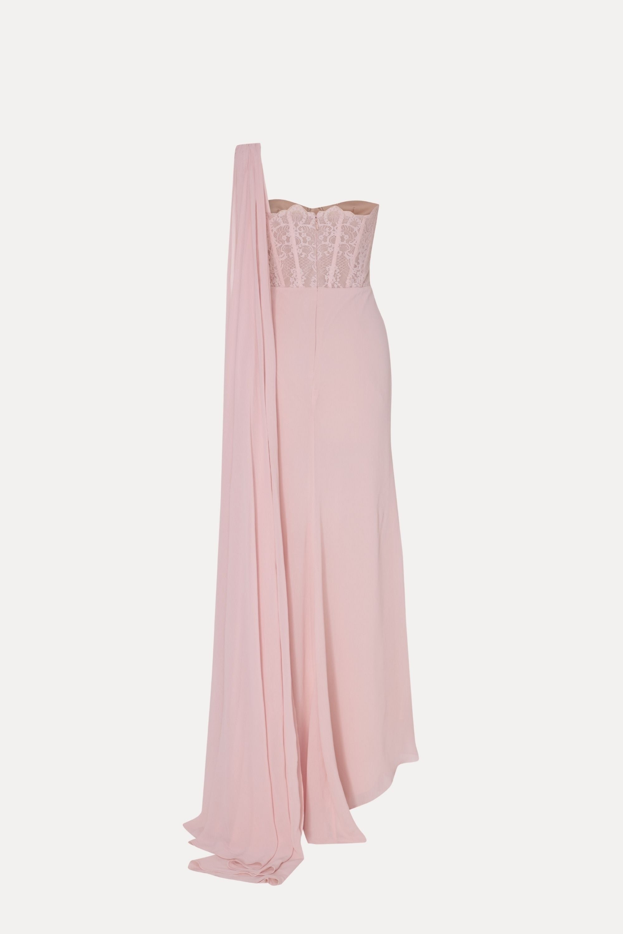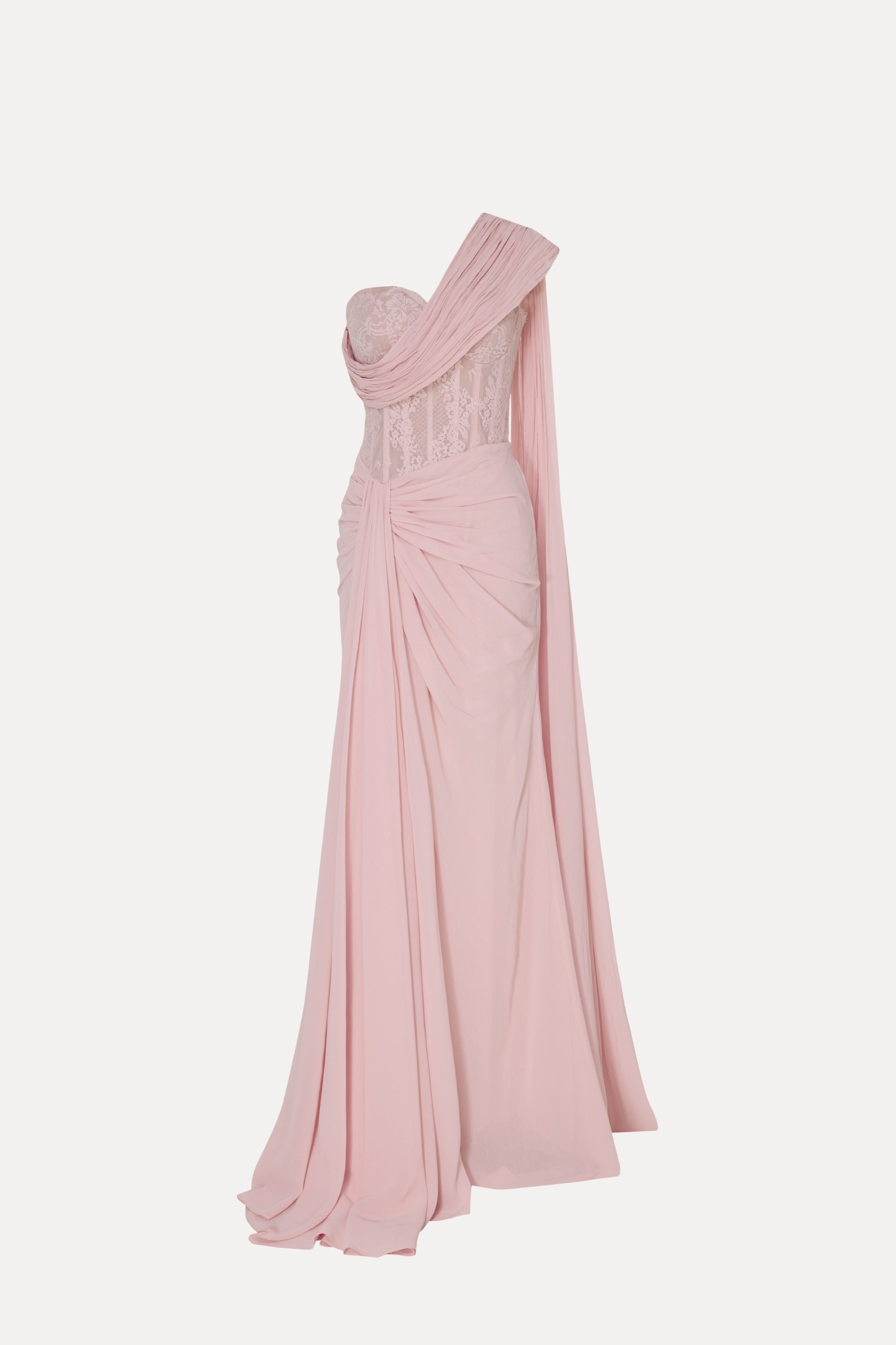An alluring one-shoulder gown featuring a lace-embroidered bodice with a sheer effect, elegantly contrasted with a draped fabric that cascades down to a flowing train. This design merges sensuality with sophistication, making it perfect for a refined evening look.