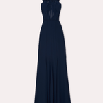 This elegant evening gown features an intricately designed neckline with crisscross straps and delicate embellishments. The floor-length silhouette flows gracefully, creating a timeless and sophisticated look.