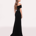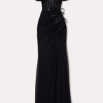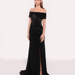 An alluring off-the-shoulder gown featuring a lace bodice that adds a touch of sensuality. The dress is adorned with oversized floral appliques at the waist, cascading into a figure-hugging draped skirt with a side slit for an elegant reveal.