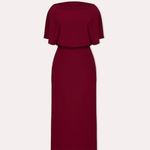 his midi dress features a gracefully draped off-the-shoulder neckline that flows into a fitted silhouette, highlighting an elegant yet minimal design. The cape-like detail adds a touch of refinement and movement, creating a polished look perfect for both formal and semi-formal events.