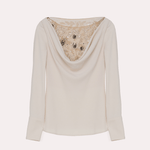 This long-sleeved top captivates with its draped back detail, revealing a delicate embroidered panel adorned with intricate floral motifs and subtle sequins. A perfect blend of elegance and charm, this piece stands out with its artistic craftsmanship.
