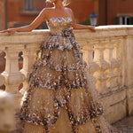 This breathtaking strapless gown showcases a voluminous layered skirt, adorned with shimmering sequins that cascade down in delicate waves. The intricately crafted floral embellishment on the waist adds a touch of romance, making this gown a captivating choice for grand occasions.
