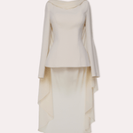 This sophisticated ensemble features a draped neckline and flowing chiffon details, creating a graceful and elegant silhouette. Ideal for formal occasions, its timeless design exudes effortless refinement.