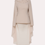 This sophisticated ensemble features a draped neckline and flowing chiffon details, creating a graceful and elegant silhouette. Ideal for formal occasions, its timeless design exudes effortless refinement.